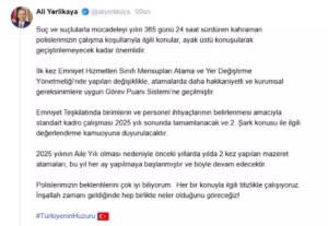 İçişleri Bakanı Ali Yerlikaya, emniyet teşkilatındaki personel ihtiyaçlarını belirlemek için standart kadro çalışmasının 2025 sonunda tamamlanacağını duyurdu. Yeni atama yönetmeliği ve her ay yapılacak mazeret atamaları hakkında bilgi verdi.